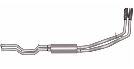 Cat-Back Performance Exhaust System Dual Sport. If you're looking to add a little Muffler Style to your Truck or SUV and want to keep the exhaust from affecting your tow trailer this Dual Cat back Exhaust System is for you exiting behind the rear tire for a look that sets your vehicle apart on the street or in the dirt. Hassle free bolt-on installation with professional looking results. No welding required. Gibson dual sport exhaust offers a powerful authoritative deep exhaust tone with no annoying noise inside the cab. Dyno tested to assure increased horsepower and produce more torque. Average horsepower gains are 10-15 and 15-20lb-ft of increase torque. Features