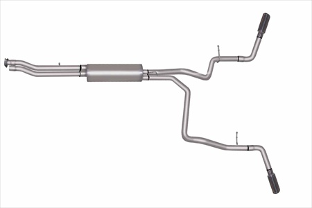 For the extremist who wants to take their truck to the next level this dual bolt-on Cat back system is for you. This system exists behind the rear tires at an aggressive angle with a powerful exhaust tone. You will gain bold street looks with powerful dyno tuned and tested street performance gains. You can expect to experience gains on average of 15-20 horsepower. Gibson muffler provides a mean performance sound and complemented with polished Stainless Tip. Easy bolt-on installation. No welding required. If you want Extreme this system is it. Features