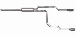 Cat-Back Performance Exhaust System Dual Split Rear. For the enthusiast who wants an awesome look and aggressive throaty sound this Dual Split Rear Cat back exhaust is for you. Gibson Exhaust Systems decrease back pressure and produce more torque and increased horsepower. Typical gains average of 15-20 horsepower. Stainless dual Tip exit straight out the back. Works with most bumpers roll pans and trailer hitches. Exhaust sound is louder under towing conditions. Hassle Free bolt- on installation. No welding required. Features