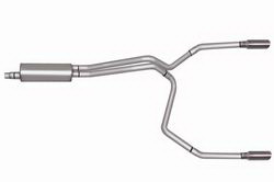 Cat-Back Performance Exhaust System Dual Split Rear. For the enthusiast who wants an awesome look and aggressive throaty sound this Dual Split Rear Cat back exhaust is for you. Gibson Exhaust Systems decrease back pressure and produce more torque and increased horsepower. Typical gains average of 15-20 horsepower. Stainless dual Tip exit straight out the back. Works with most bumpers roll pans and trailer hitches. Exhaust sound is louder under towing conditions. Hassle Free bolt- on installation. No welding required. Features