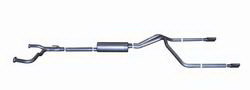 Cat-Back Performance Exhaust System Dual Split Rear. For the enthusiast who wants an awesome look and aggressive throaty sound this Dual Split Rear Cat back exhaust is for you. Gibson Exhaust Systems decrease back pressure and produce more torque and increased horsepower. Typical gains average of 15-20 horsepower. Stainless dual Tip exit straight out the back. Works with most bumpers roll pans and trailer hitches. Exhaust sound is louder under towing conditions. Hassle Free bolt- on installation. No welding required. Features