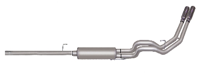 Cat-Back Performance Exhaust System Dual Sport. If you are looking to add a little style to your Truck or SUV and want to keep the exhaust from affecting your tow trailer this Dual Cat back Exhaust System is for you exiting behind the rear tire for a look that sets your vehicle apart on the street or in the dirt. Hassle free bolt-on installation with professional looking results. No welding required. Gibson dual sport exhaust offers a powerful authoritative deep exhaust tone with no annoying noise inside the cab. Dyno tested to assure increased horsepower and produce more torque. Average horsepower gains are 10-15 and 15-20lbs.-ft. of increase torque. Features